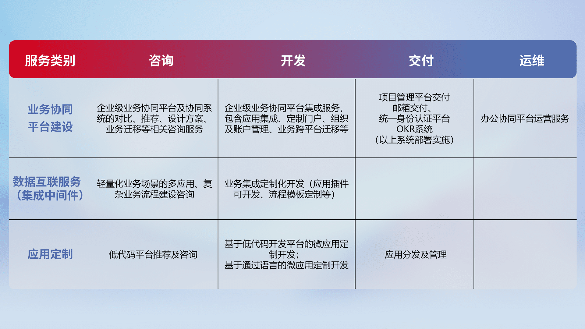 针对钉钉、、、企微、、IDaas等平台级产品提供产品的规划、、、、方案、、交付、、、、定制化开发等服务,,实现如统一协同办公、、智能客户服务、、、混合会议管理、、、、智能数据查询、、等业务场景,,,实现数字化转型。。。